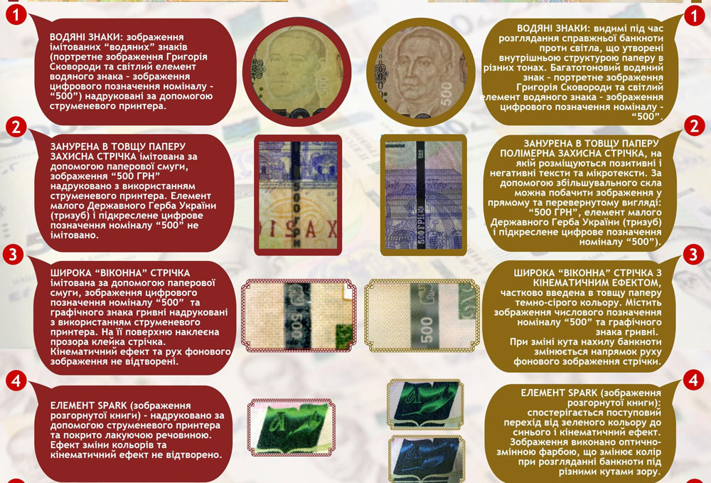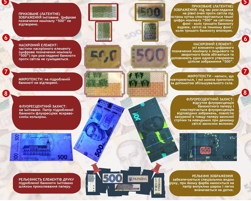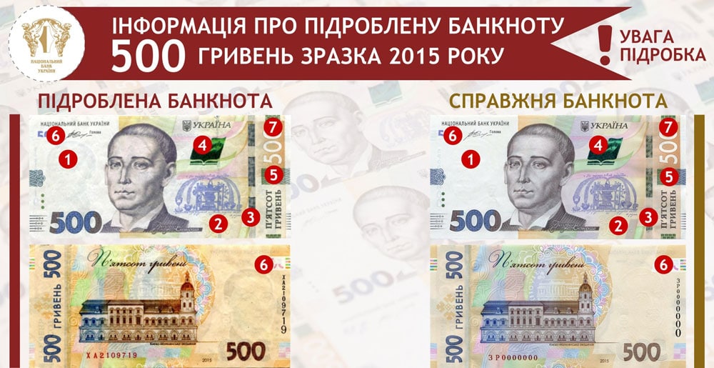 Нацбанк зареєстрував випадки підробки нових купюр номіналом 500 грн, які були введені в обіг в квітні 2016 року. Про це регулятор повідомив на своєму офіційному сайті. Методи визначення підробки.
