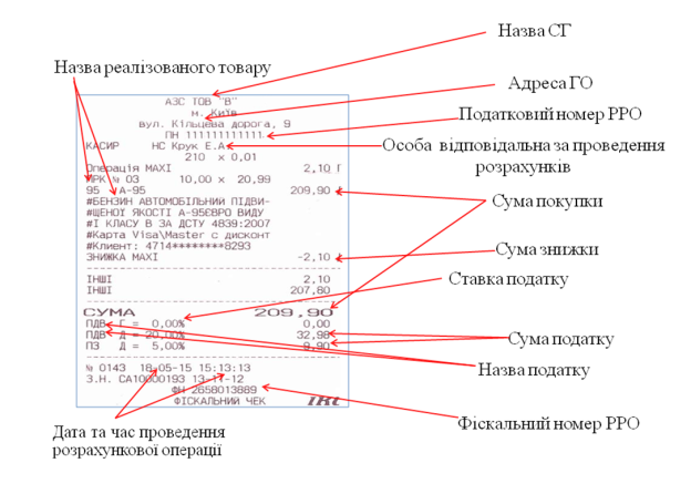 Приклад розрахункового документа (чеку) із позначенням його основних реквізитів наведено на малюнку.